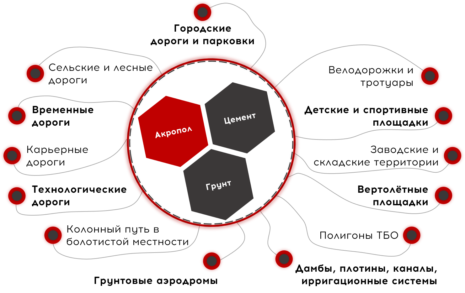 Технология укрепления грунта модификатором АКРОПОЛ ГС может применяться при строительстве/ремонте любых объектов.